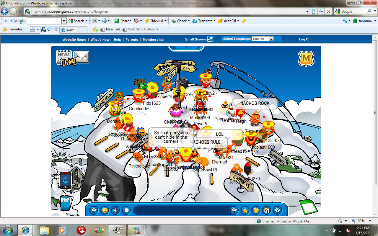 Today was probably the best the Nachos have done in quite a while. This just shows how great of a year 2011 will be. We maxed at over 50 soldiers!We also we able to make a circle in the Snowforts and the Ski Hill! I am so proud of you guys you performed tactics well and we had a big chat and big numbers on CP. If we have battle like this every week we will be HUGE! So I need you recruiting and patrolling as much as you can.