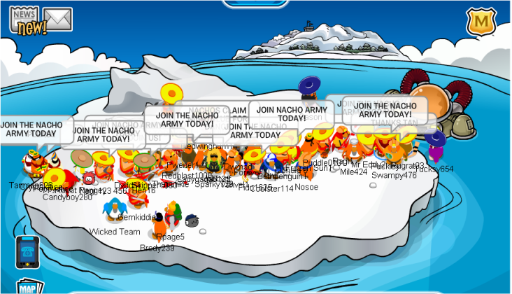 Welcome to the Nachos! We were one of the most powerful and legendary armies in all of Club Penguin. Known for our fun and enjoyable atmosphere, we're always having a good time! Due to Club Penguin shutting down, the army is mostly inactive. However, our older members tend to keep in touch using discord. You can join using the following link.