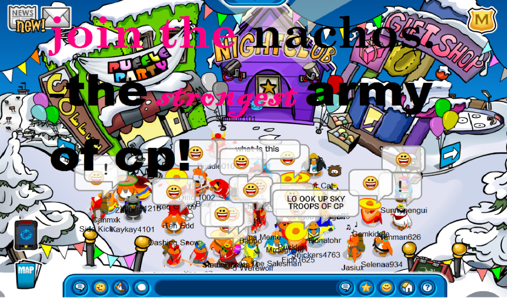 Welcome to the Nachos! We were one of the most powerful and legendary armies in all of Club Penguin. Known for our fun and enjoyable atmosphere, we're always having a good time! Due to Club Penguin shutting down, the army is mostly inactive. However, our older members tend to keep in touch using discord. You can join using the following link.