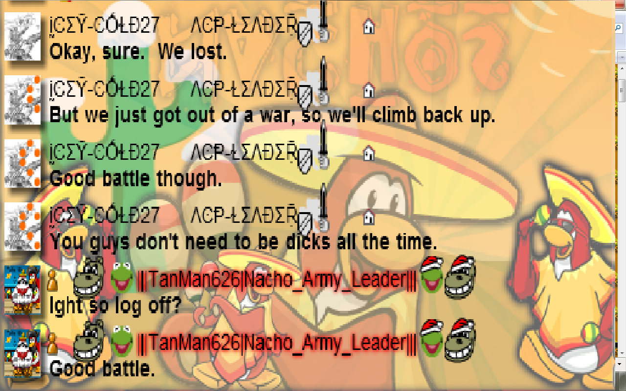 Next, we moved to the Dojo for a massive battle. Entering the Dojo will still around 25-30 Nachos and about 20-25 ACP we had a left vs right battle. The Nachos had a slight advantage in tactics and size. After a few charges we both ended up with lines going across the room with Nachos still having and advantage of Size and a tie in tactics. We then had a couple more charges and the ACP dropped to about 10-15 and Nachos around 15-20. It was getting late and the battle was dragging on so me and Mchappy both talked and debated a while for who won and we finally came to see that Nachos won.