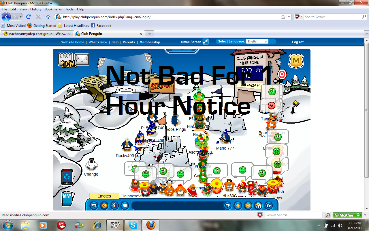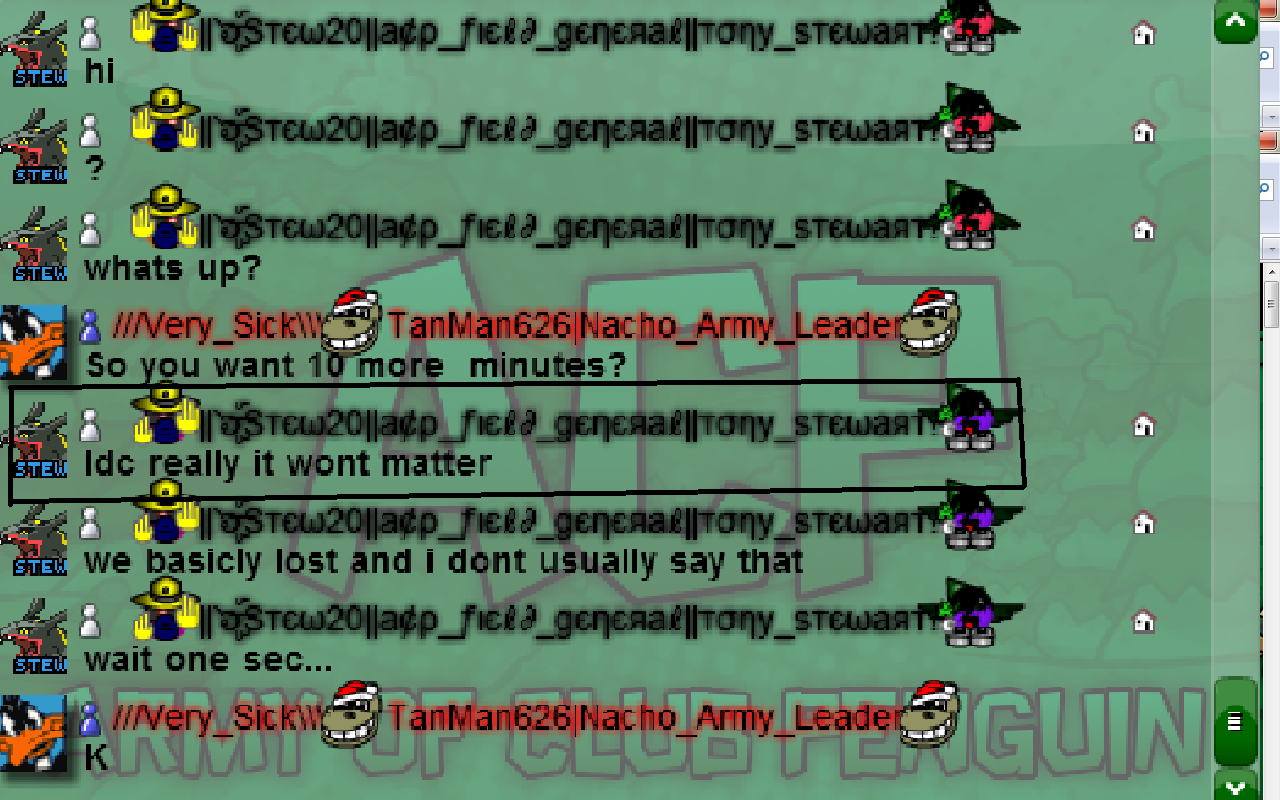 Well, last night me and Bobcatboy agreed to have a Practice Battle immediately after school for EST and go to 8 EST. I accepted and made the post today while I was sick so no one saw it. So basically with no warning of the battle the Nachos still reached numbers up to 35-40 while ACP got around 20 at most! We had great tactics and you have made me very proud today Nachos. Hopefully us and ACP can have more of the Practice Battles for practice for both armies! Good battle ACP.