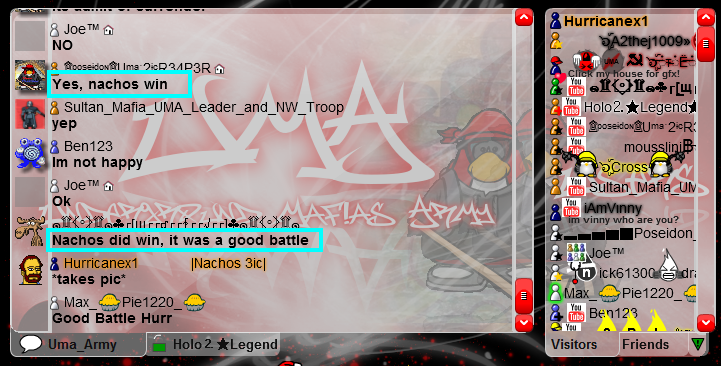 21. I’m disapointed. UMA can’t help having hackers in their army. I am in UMA, I am in Nachos aswell. I have been abused by mods and ignored by almost everyone. You have randomly declared war on UMA and you even put ‘UMA_SHALL_FALL!’ in your name. They have done nothing, insulting/declaring war on them is just childish. Next time, actually find a reason to insult someone and not just invade us and quote in our faces ‘WE BEAT U HAHAH!’ or ‘UMA SHALL FALL BECUASE NACHOS ARE BETTA!!!!!111’. As someone from UMA, I feel like I am being left out in this army. I am a General here, I am jus disapointed that you have bullied one of your own soldiers, let alone other people.