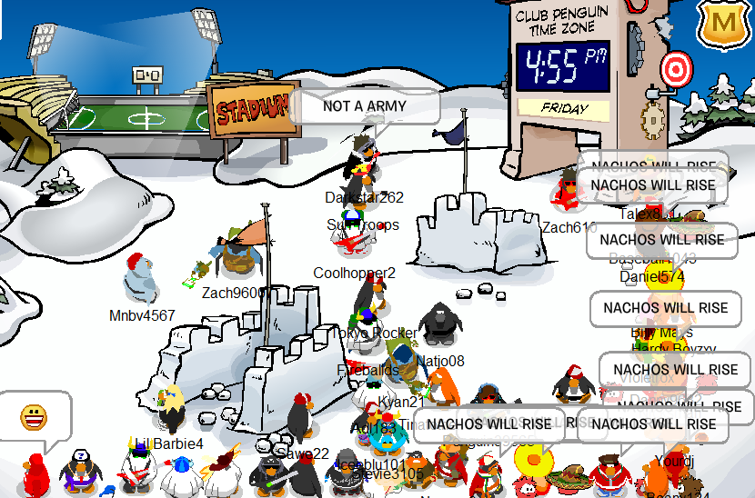 Welcome to the Nachos! We were one of the most powerful and legendary armies in all of Club Penguin. Known for our fun and enjoyable atmosphere, we're always having a good time! Due to Club Penguin shutting down, the army is mostly inactive. However, our older members tend to keep in touch using discord. You can join using the following link.