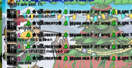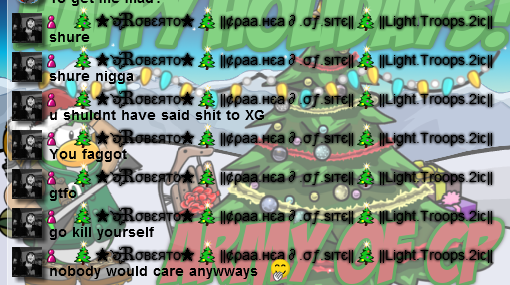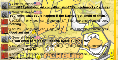 So today King John pc’d me some pictures of 2 owners rank in Light Troops(Roberto, and BluePaint whom is the main leader :/). They were saying some pretty mean things, or should I say VERY mean things to King John. Now I know people are sometimes mean on the intrenet but this is crossing the line. This is against the law actual and violates an Intrenet law known as “Cyber Bullying”. Now I could have the intrenet police get Rob and BP in alot of trouble but I won’t. Here is the pictures..