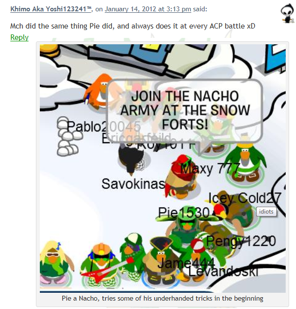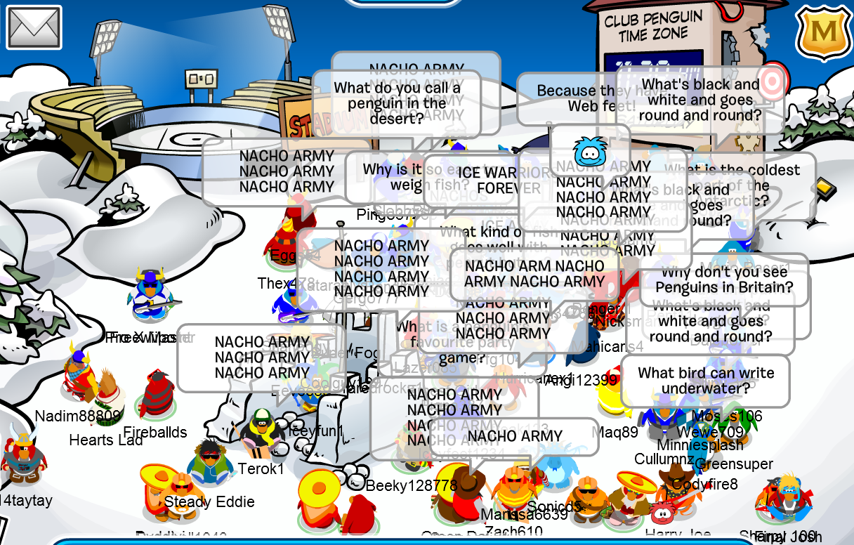 Welcome to the Nachos! We were one of the most powerful and legendary armies in all of Club Penguin. Known for our fun and enjoyable atmosphere, we're always having a good time! Due to Club Penguin shutting down, the army is mostly inactive. However, our older members tend to keep in touch using discord. You can join using the following link.