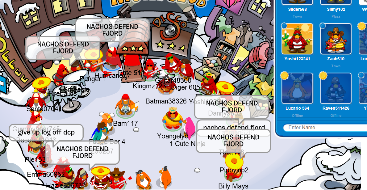 Welcome to the Nachos! We were one of the most powerful and legendary armies in all of Club Penguin. Known for our fun and enjoyable atmosphere, we're always having a good time! Due to Club Penguin shutting down, the army is mostly inactive. However, our older members tend to keep in touch using discord. You can join using the following link.