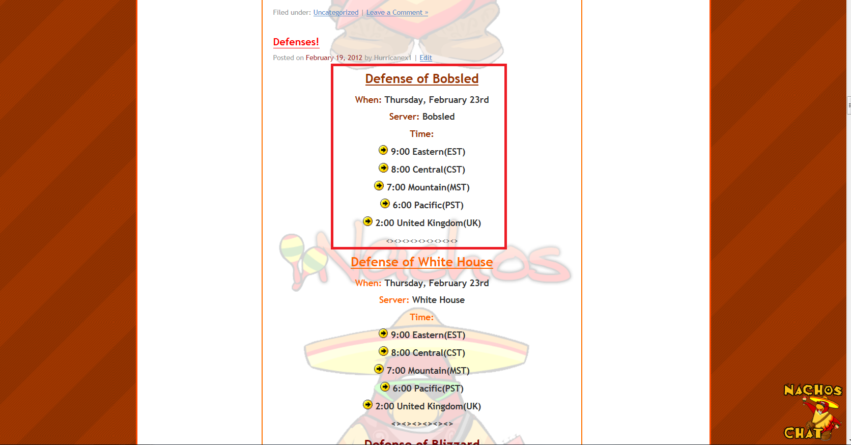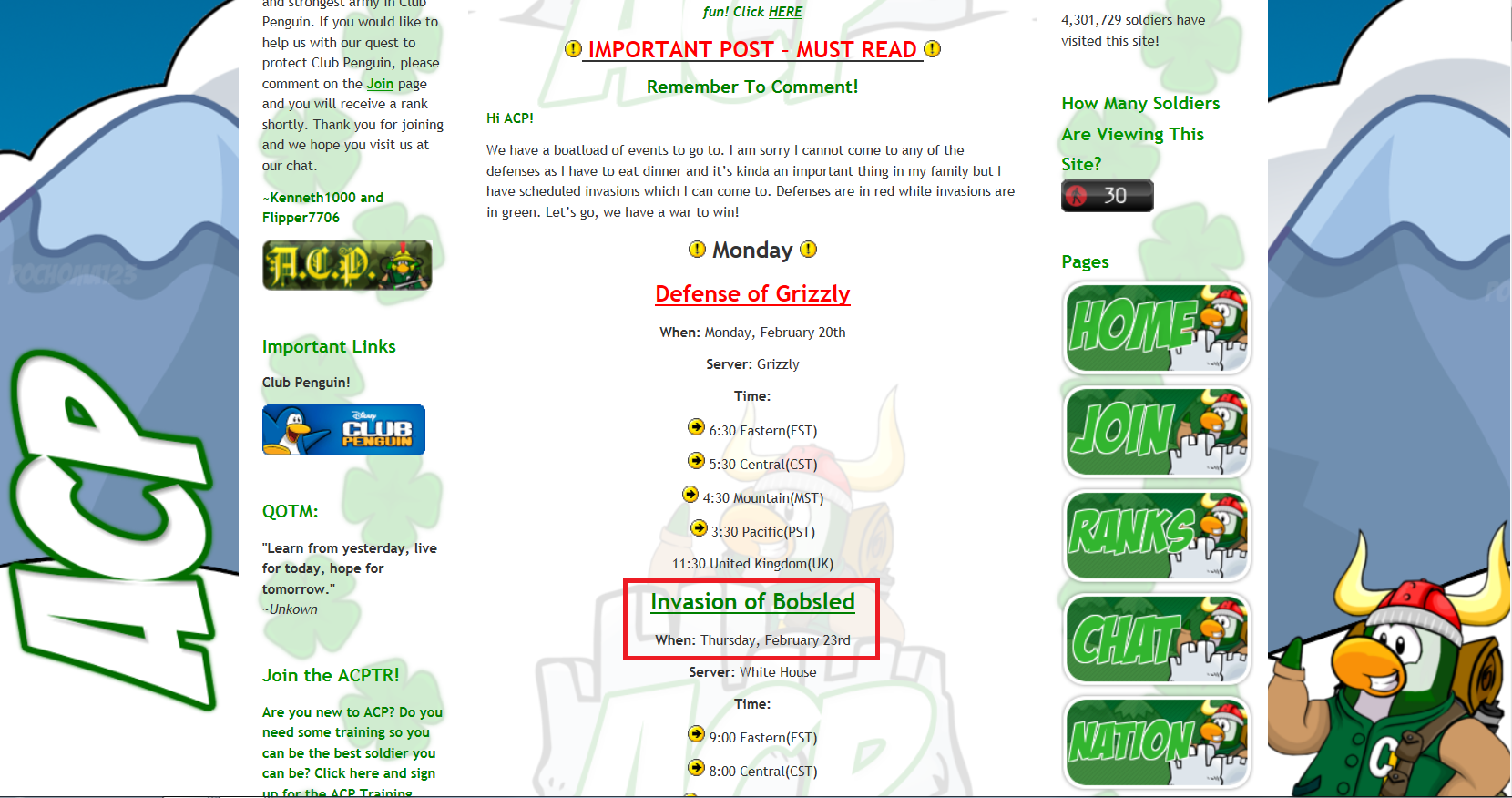 I was searching thru the ACP’s website, and I found that it stated the battles for today(Monday) were Defense of Grizzly and Invasion of Bobsled. I then was told by Tanman626 that ACP said they were invading 1 hour and 30 minutes after our Invasion of Grizzly. I then thought to myself that the Nachos only had one event today. That was to invade Grizzly. So, I quickly checked their site and I found this: