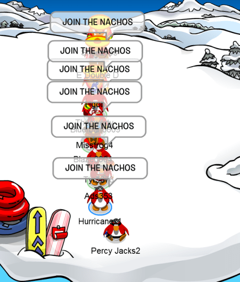 Welcome to the Nachos! We were one of the most powerful and legendary armies in all of Club Penguin. Known for our fun and enjoyable atmosphere, we're always having a good time! Due to Club Penguin shutting down, the army is mostly inactive. However, our older members tend to keep in touch using discord. You can join using the following link.
