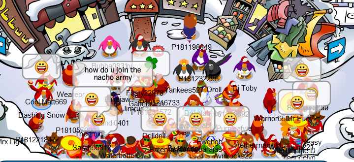 Welcome to the Nachos! We were one of the most powerful and legendary armies in all of Club Penguin. Known for our fun and enjoyable atmosphere, we're always having a good time! Due to Club Penguin shutting down, the army is mostly inactive. However, our older members tend to keep in touch using discord. You can join using the following link.