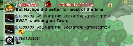 Another awesome day for nachos! With sizes of 45-50+, we overpower the ACP+AR. They are like a house of cards, that with one simple blow we can knock them down. I enjoyed watching ACP stealing our new tactics and using 6+ joke bombs. How pleasant, right? Anyways, I’m proud to be leading such awesome troops. Keep it up guys! 😉