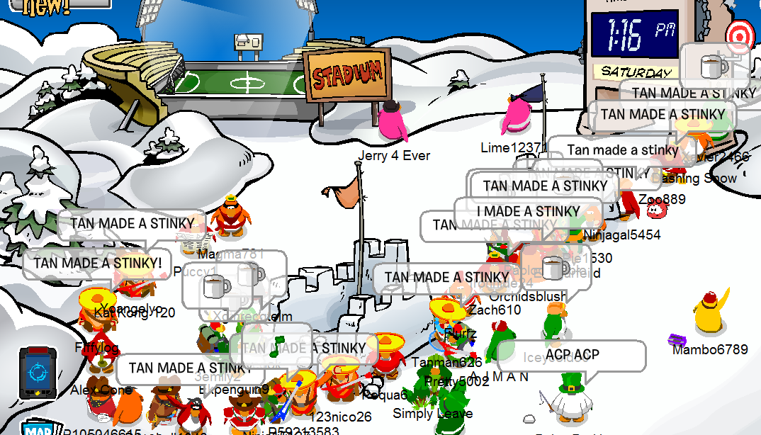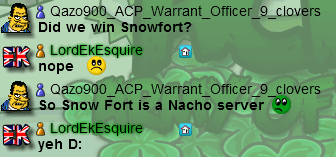 Another one-sided battle. Nachos had around 25-30 while ACP was around 10. The ACP owners were too stubborn to just admit defeat though, and forced us to have the most boring battle ever on Snow Fort for an hour. I really applaud ACP for their immaturity in this one (:. It was an obvious victory for the Nacho empire. Next time I expect better number out of us though, at most we had 30 and we were aiming for 40.