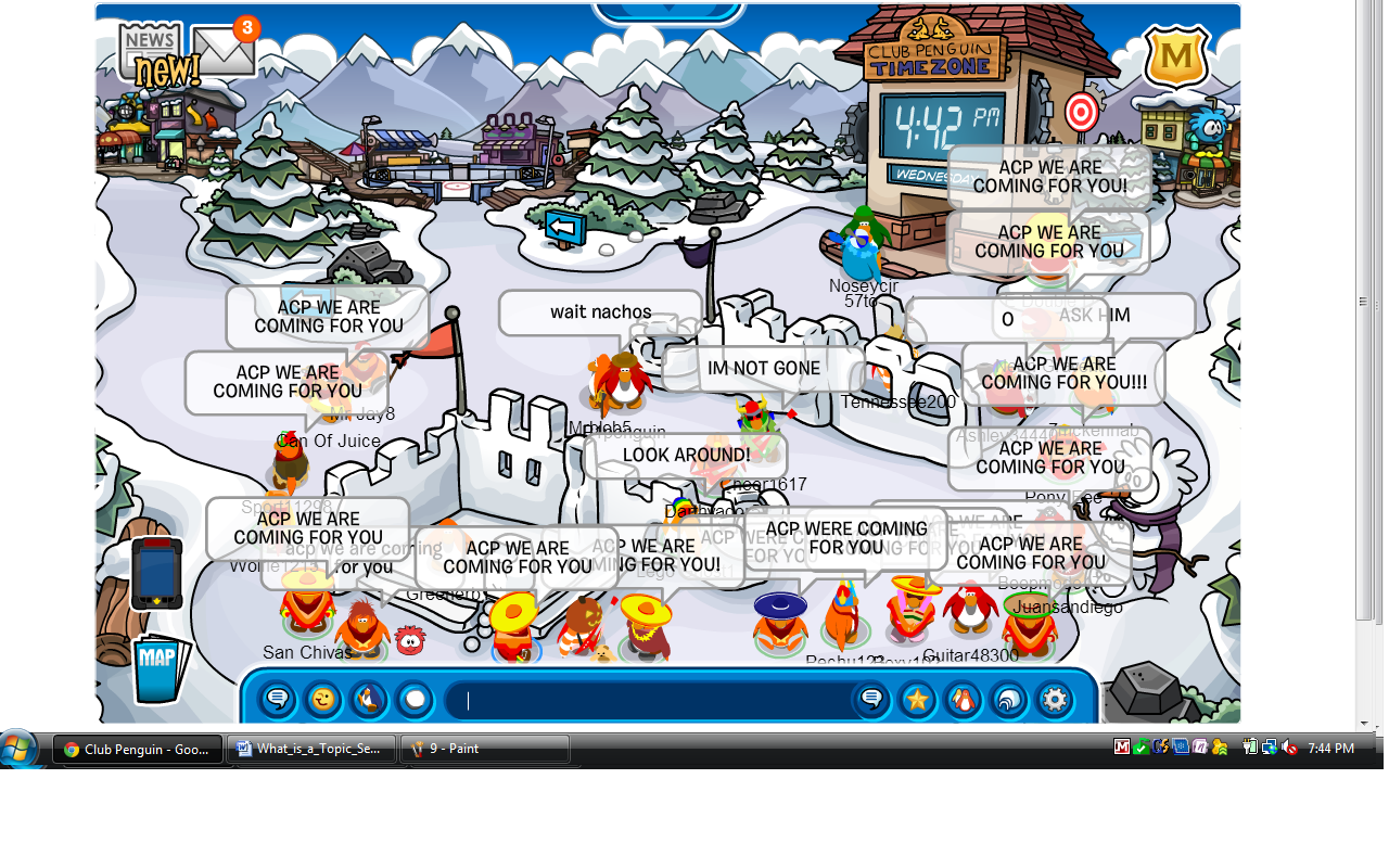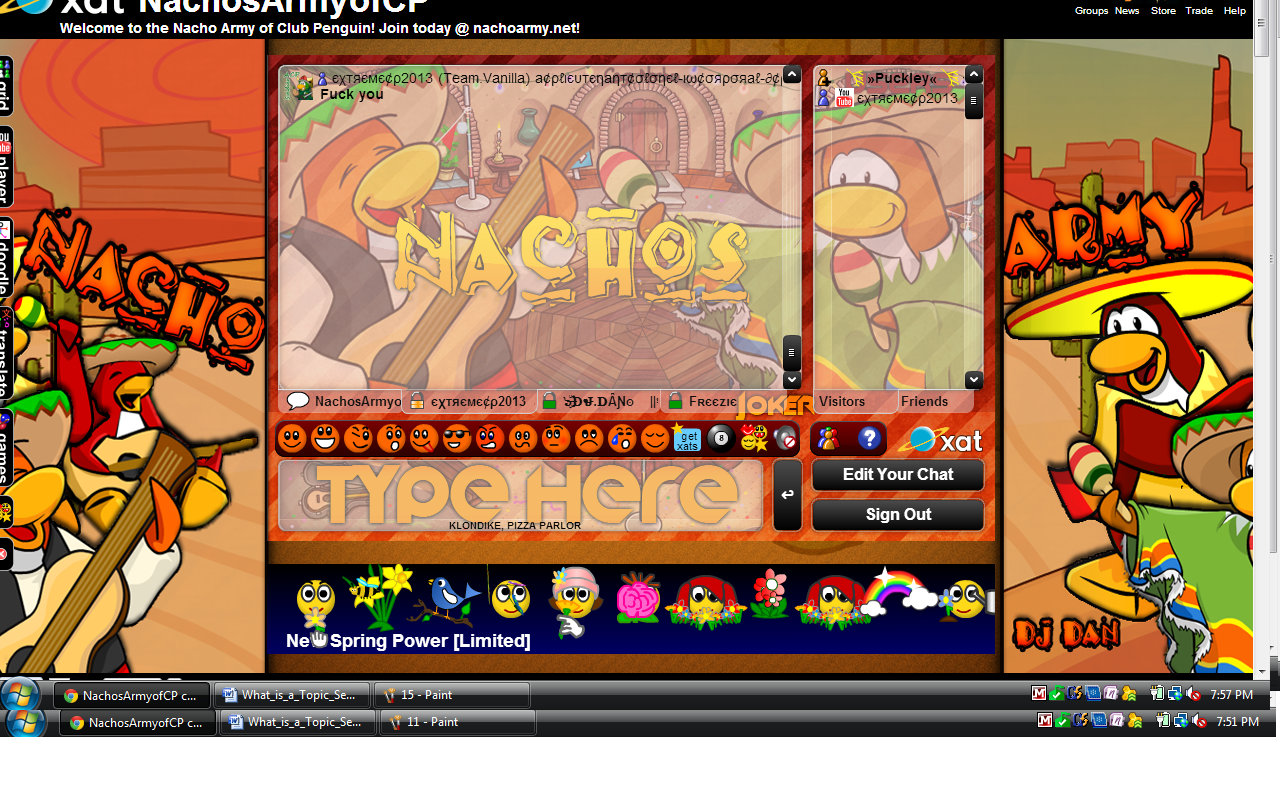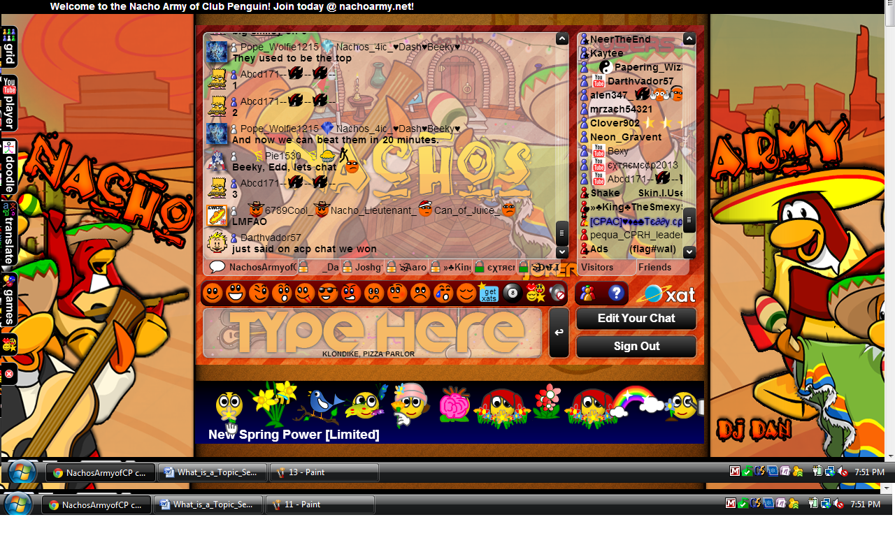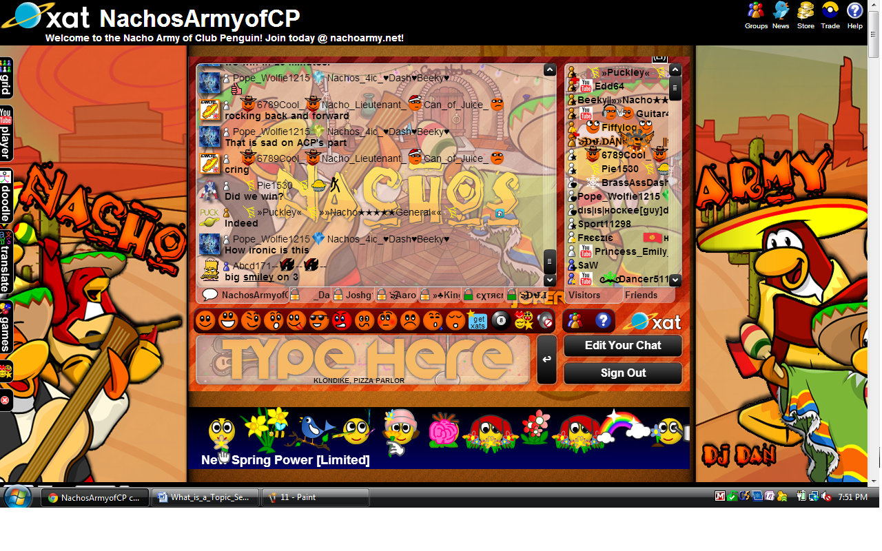 Welcome to the Nachos! We were one of the most powerful and legendary armies in all of Club Penguin. Known for our fun and enjoyable atmosphere, we're always having a good time! Due to Club Penguin shutting down, the army is mostly inactive. However, our older members tend to keep in touch using discord. You can join using the following link.