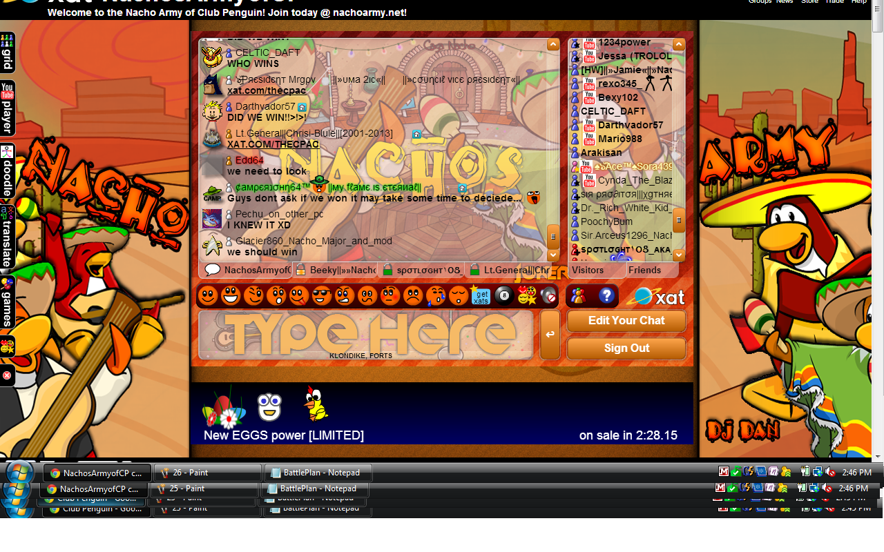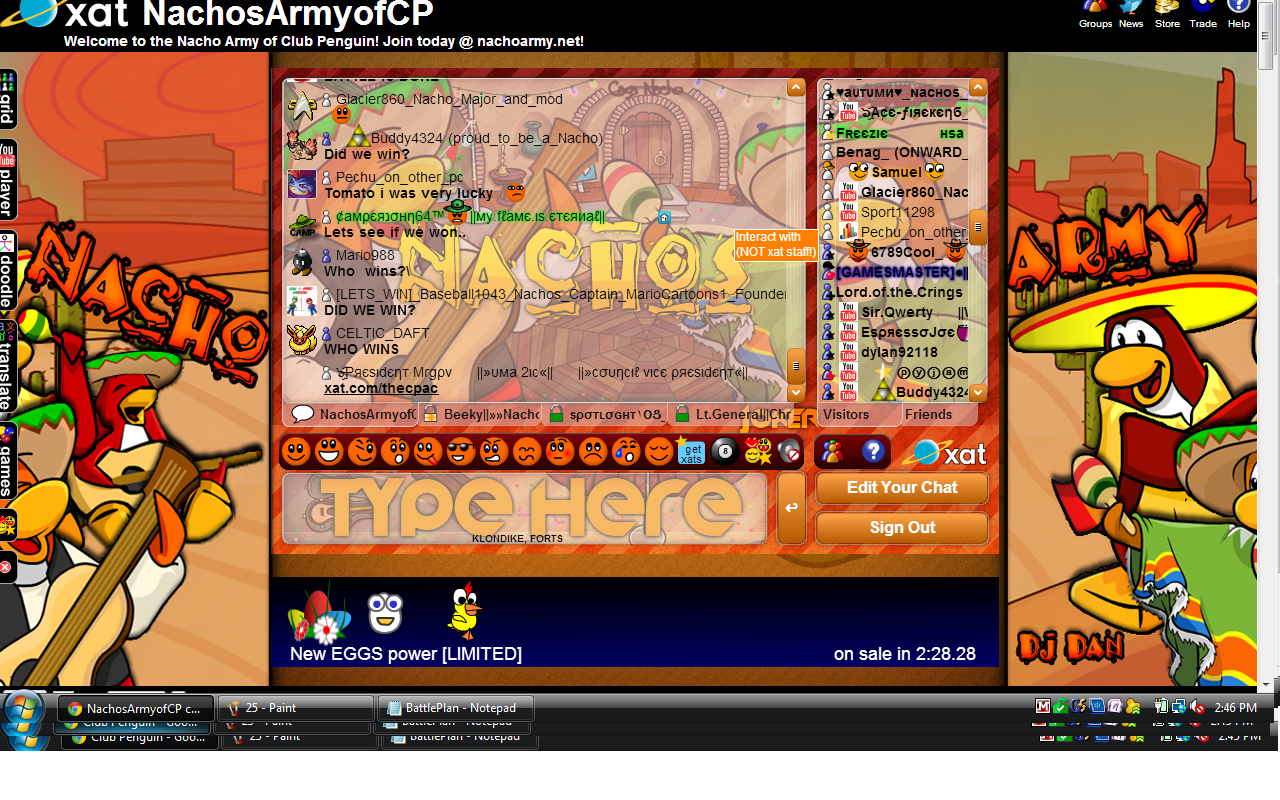 Welcome to the Nachos! We were one of the most powerful and legendary armies in all of Club Penguin. Known for our fun and enjoyable atmosphere, we're always having a good time! Due to Club Penguin shutting down, the army is mostly inactive. However, our older members tend to keep in touch using discord. You can join using the following link.