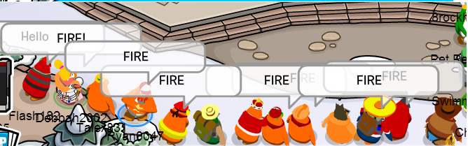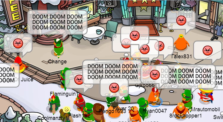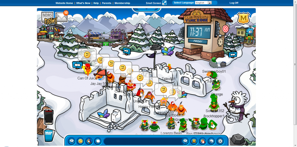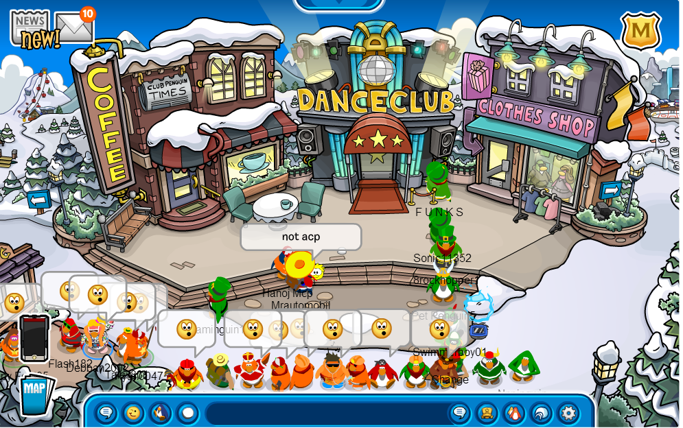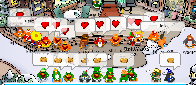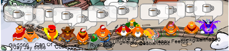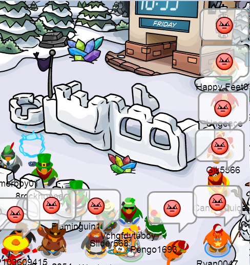 Then, after a lot of combat had taken place at the town – (This had all taken us up to about 19:32) ACP used the map, however they only went to the snowforts. We charged in there win an E+P puffle bomb, and then we formed a very nice Diagonal line (after some prompting the troops to spread out more – we need to work on that, guys!) and pulled off some nice tactics.