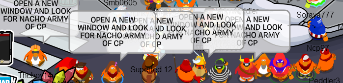 Welcome to the Nachos! We were one of the most powerful and legendary armies in all of Club Penguin. Known for our fun and enjoyable atmosphere, we're always having a good time! Due to Club Penguin shutting down, the army is mostly inactive. However, our older members tend to keep in touch using discord. You can join using the following link.
