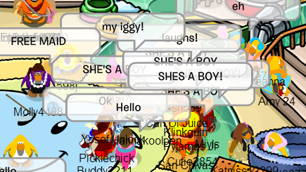 And other things like “Needz rich mu mu”. I think we just got mugged by Bay Bees. Anyways, since we and these bots charged into the pet shop, obviously the little kids who wanted to be pookies who came in to see if there was anyone else in the pet shop to show off to, saw that there were indeed many penguins inside. Then, the bots buggered off and we, the valiant and noble nachos of Club Penguin…. Managed to troll some REAL pookies.