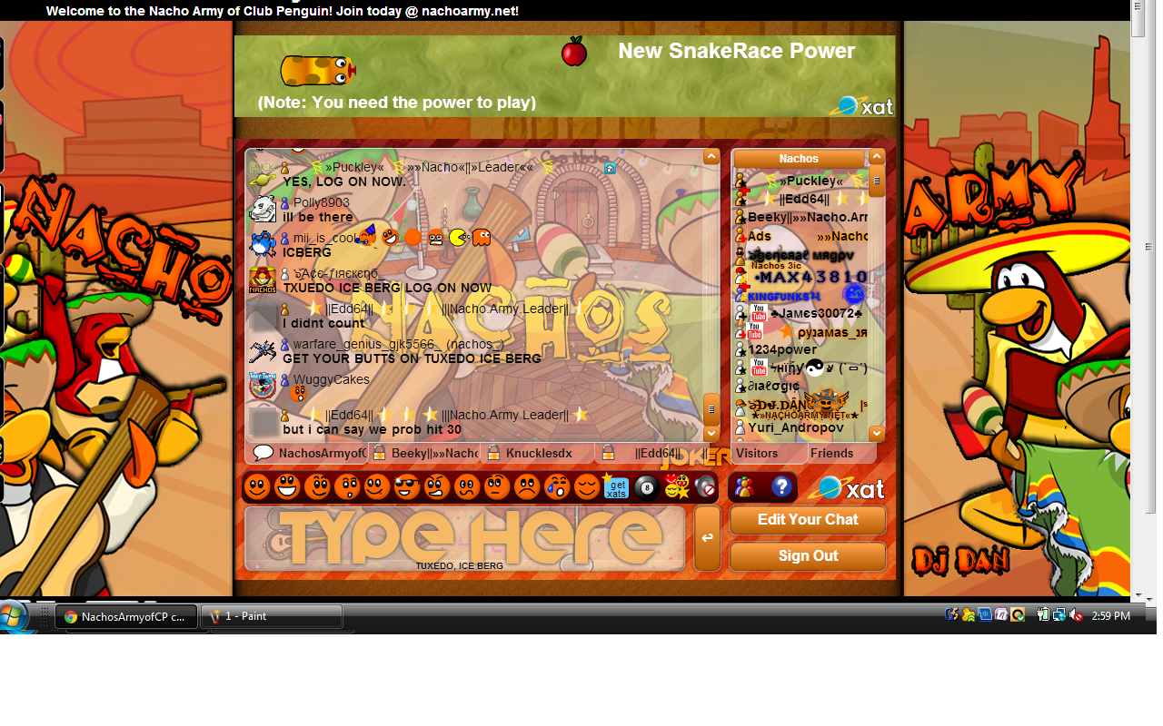 Welcome to the Nachos! We were one of the most powerful and legendary armies in all of Club Penguin. Known for our fun and enjoyable atmosphere, we're always having a good time! Due to Club Penguin shutting down, the army is mostly inactive. However, our older members tend to keep in touch using discord. You can join using the following link.