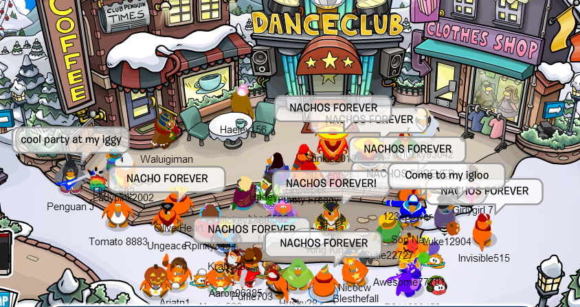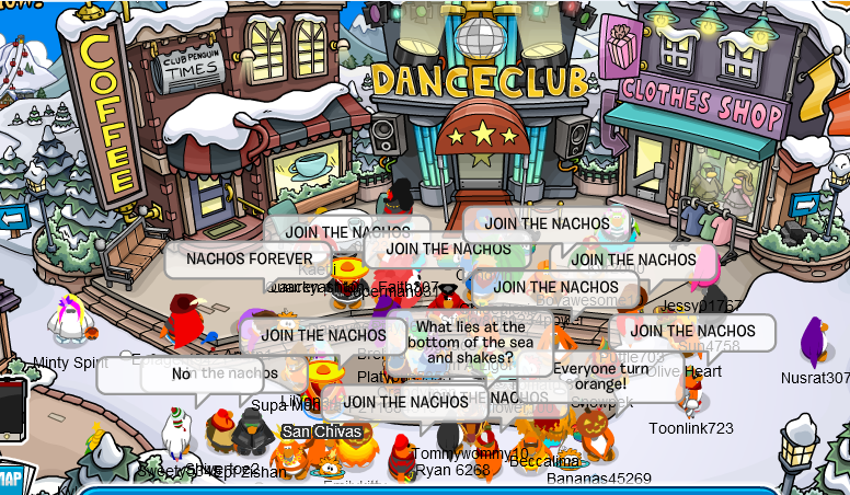 Welcome to the Nachos! We were one of the most powerful and legendary armies in all of Club Penguin. Known for our fun and enjoyable atmosphere, we're always having a good time! Due to Club Penguin shutting down, the army is mostly inactive. However, our older members tend to keep in touch using discord. You can join using the following link.