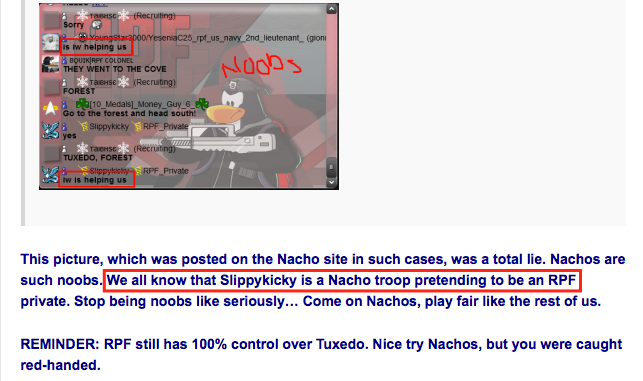 In the picture below, Garrett claims that Slippykicky is a Nacho troop that is pretending to be a RPF Private. This is a completely false statement and I will provide proof later on in the post. Why would we send one of our troops to pretend to be in your army midst battle? Don’t even answer that question because we wouldn’t.