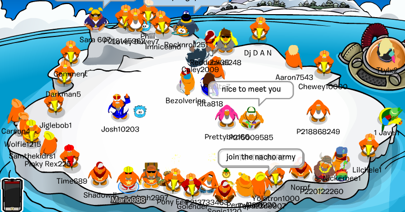 Welcome to the Nachos! We were one of the most powerful and legendary armies in all of Club Penguin. Known for our fun and enjoyable atmosphere, we're always having a good time! Due to Club Penguin shutting down, the army is mostly inactive. However, our older members tend to keep in touch using discord. You can join using the following link.