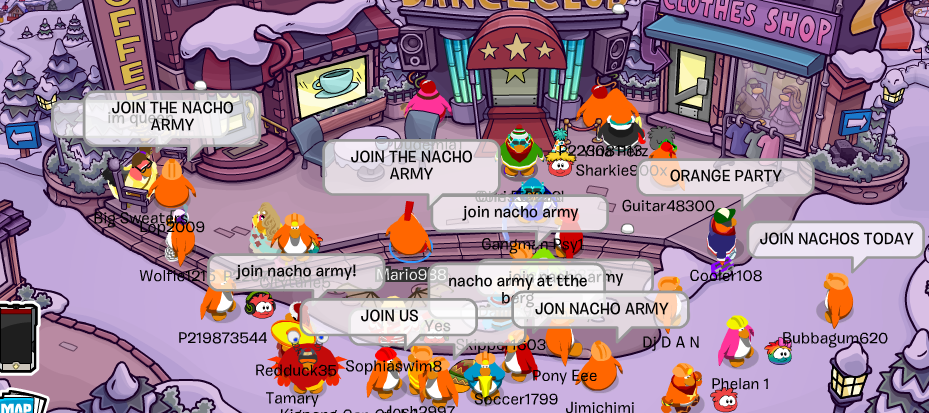 Welcome to the Nachos! We were one of the most powerful and legendary armies in all of Club Penguin. Known for our fun and enjoyable atmosphere, we're always having a good time! Due to Club Penguin shutting down, the army is mostly inactive. However, our older members tend to keep in touch using discord. You can join using the following link.