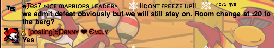 Today’s battle was a major success! We did outstanding with sizes of 18-20 and our tactics were not too shabby either! The event was a Practice Battle against the Ice Warriors and it was really fun! The Ice Warriors didn’t do too bad themselves and were a great opponent for us. We started off in the Snow Forts, and then moved into the Ice Rink where we attacked and battled the Ice Warriors. Afterwards, with ten minutes before the end of the battle, both armies moved to the Ice Berg and formed two great formations. Overall, excellent job today, Nachos!