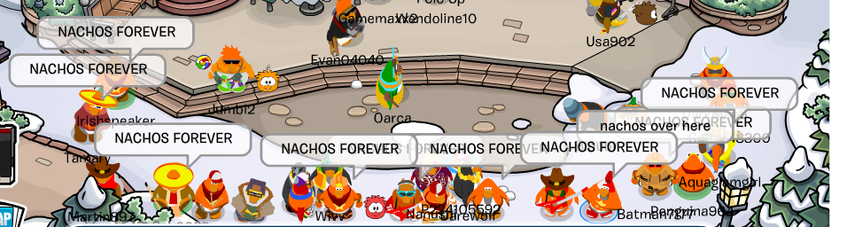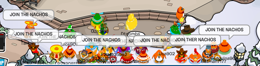Welcome to the Nachos! We were one of the most powerful and legendary armies in all of Club Penguin. Known for our fun and enjoyable atmosphere, we're always having a good time! Due to Club Penguin shutting down, the army is mostly inactive. However, our older members tend to keep in touch using discord. You can join using the following link.