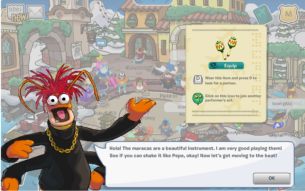 2. Now, MEMBERS: find Pepe (that dude sitting in the Dock) and equip yourself with the maracas. Wear this item, then press D (dance) to look for a partner. Next, click the emote that will appear to join in the act with the other person.