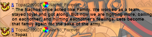 Topaz couldn’t be anymore right about this. I want Nachos to come together again, we’re an army, right? I don’t want people always arguing and fighting, especially for power. As a troop, I believe you are supposed to respect your higher rank, which I also feel this army struggles with. You have the rank that you were assigned because that’s where the leaders felt you would do your best, we have promotions just to prove that you CAN exceed that observation. All I ask is, please don’t be upset if you are given a rank you don’t like, I promise you will receive a proper liked rank if you do what you are told. I want the Nachos to have a freedom of speech, that’s what our army is known for, but again, this army needs to work on respect. Respect for your upper, your lower, and everyone else.