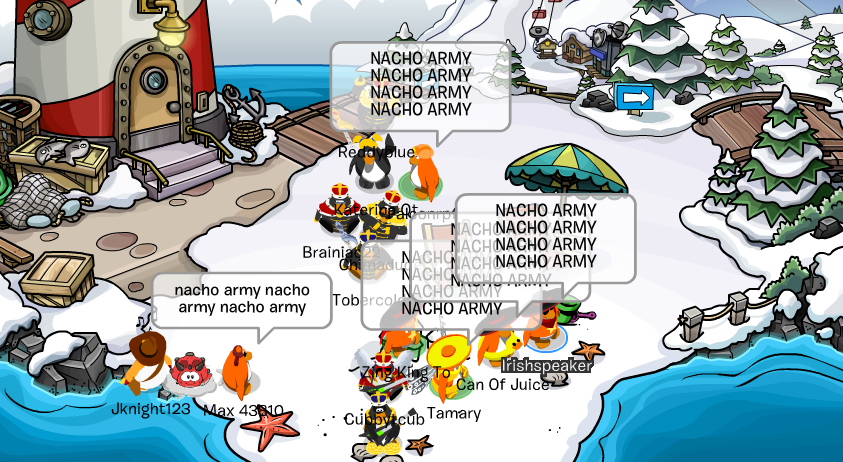 Welcome to the Nachos! We were one of the most powerful and legendary armies in all of Club Penguin. Known for our fun and enjoyable atmosphere, we're always having a good time! Due to Club Penguin shutting down, the army is mostly inactive. However, our older members tend to keep in touch using discord. You can join using the following link.