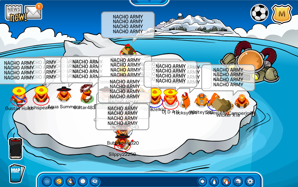 Welcome to the Nachos! We were one of the most powerful and legendary armies in all of Club Penguin. Known for our fun and enjoyable atmosphere, we're always having a good time! Due to Club Penguin shutting down, the army is mostly inactive. However, our older members tend to keep in touch using discord. You can join using the following link.