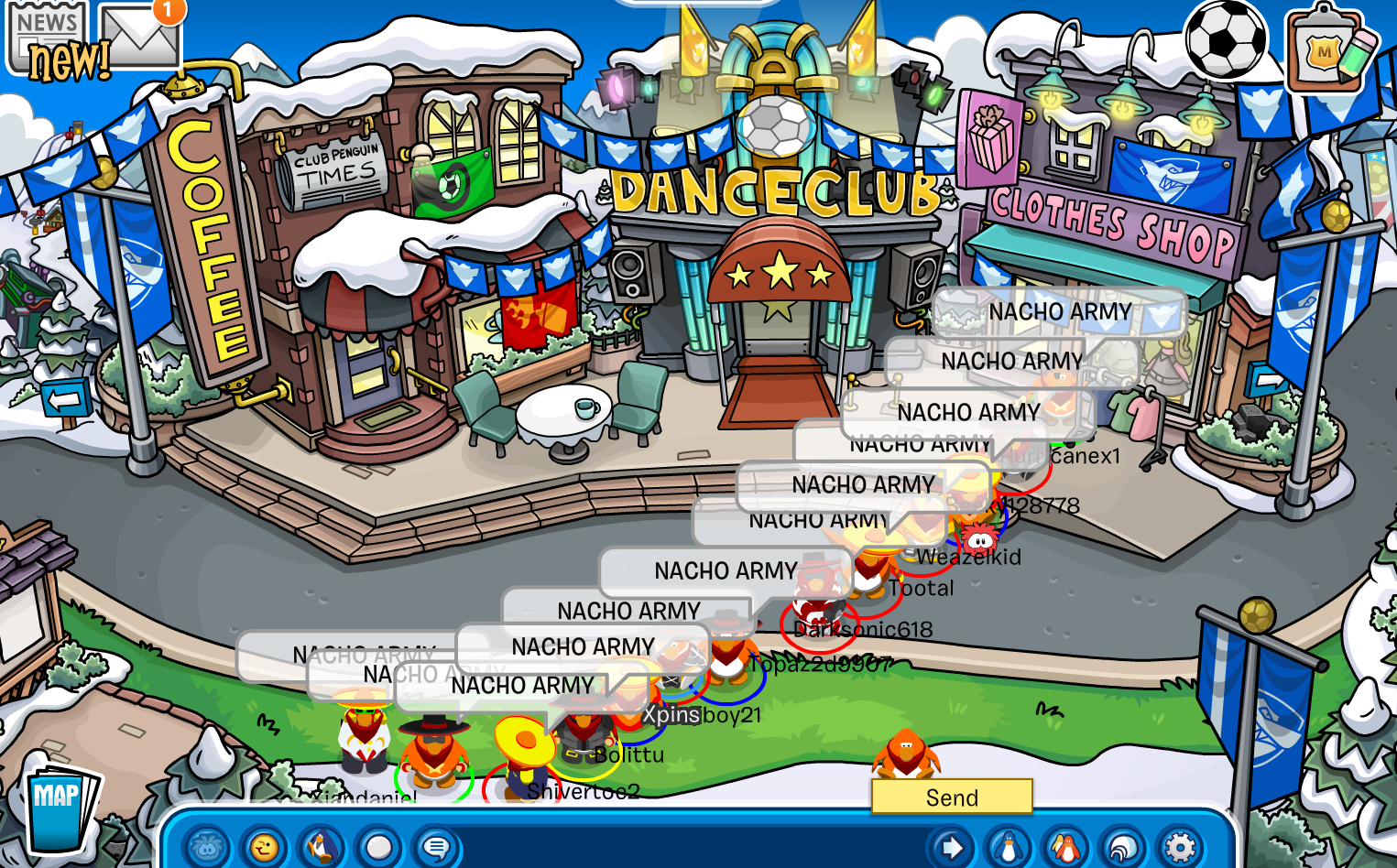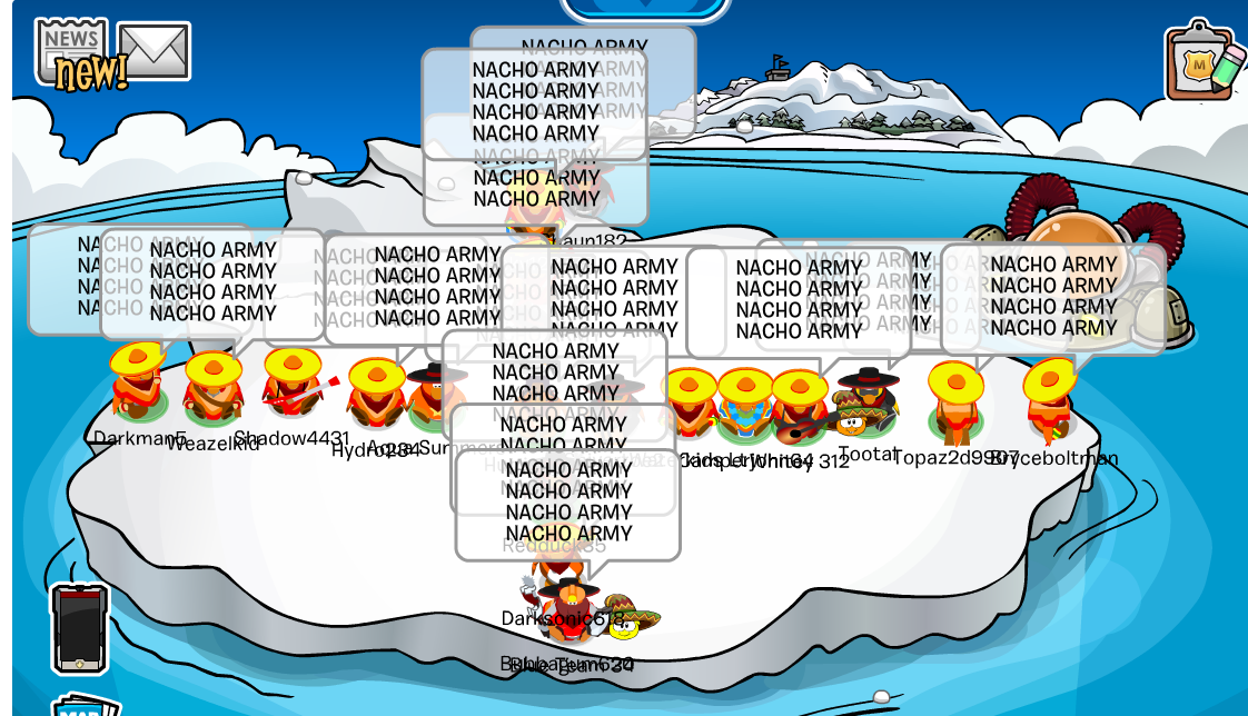 Welcome to the Nachos! We were one of the most powerful and legendary armies in all of Club Penguin. Known for our fun and enjoyable atmosphere, we're always having a good time! Due to Club Penguin shutting down, the army is mostly inactive. However, our older members tend to keep in touch using discord. You can join using the following link.