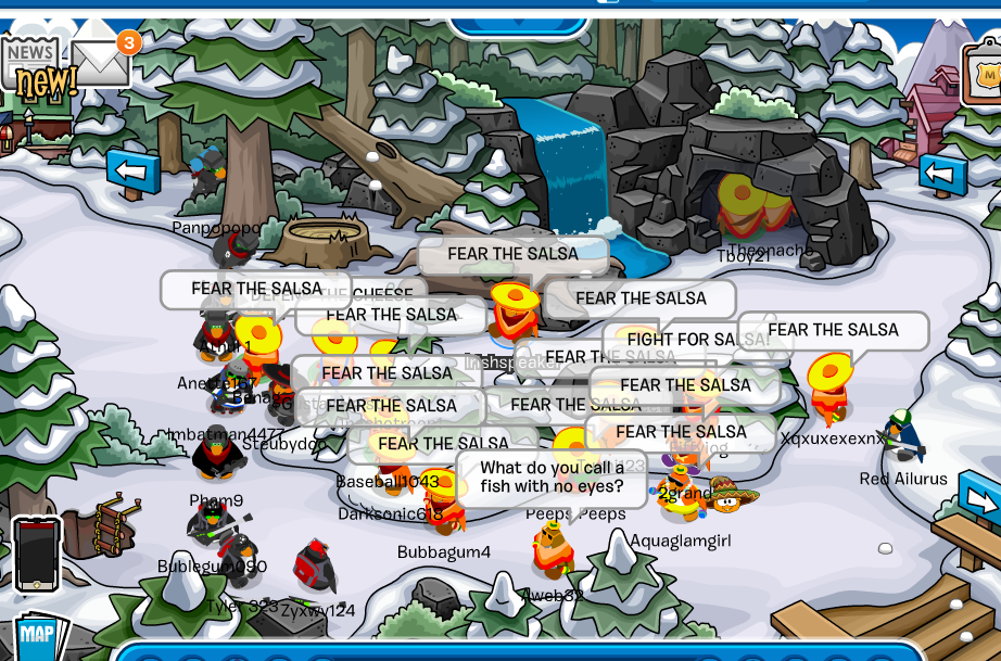 We logged on to Klondike to invade Adventure, hosted by our UK and  US division! The Rebel Penguin Federation were small fries, and our tactics and size outweighed them, giving us an automatic win. We maxed 27, and averaged 24 throughout the event, while the RPF maxed 2, and averaged 1. Again, the PR decided to raid our invasion, but we beat them as well, making us the true champs.