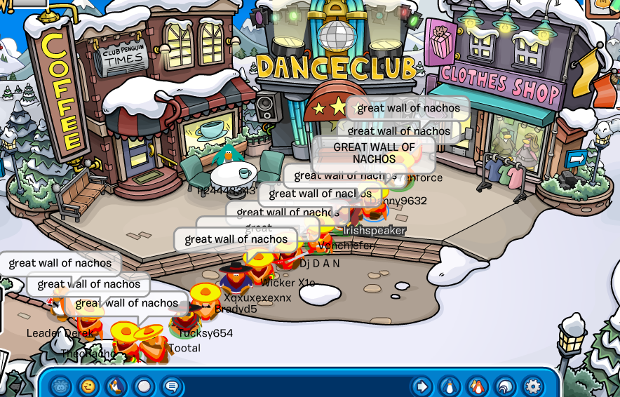 Welcome to the Nachos! We were one of the most powerful and legendary armies in all of Club Penguin. Known for our fun and enjoyable atmosphere, we're always having a good time! Due to Club Penguin shutting down, the army is mostly inactive. However, our older members tend to keep in touch using discord. You can join using the following link.
