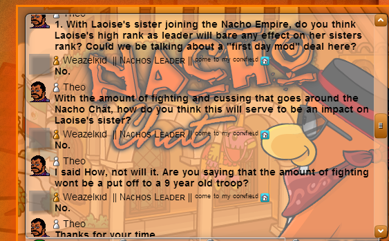 Laoise has recently told us all that her sister, currently 8 years old will be joining the Nacho Empire when she turns 9. This must make people wonder how this will effect both the Nachos and Laoise’s leadership. I managed to speak to Weazelkid who seemed annoyed that Beeky had rejected him previously.