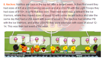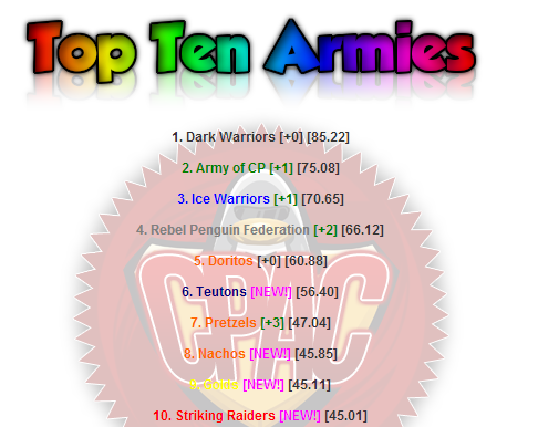 Before I start, NADN stands for Nacho Army Daily News (original, I know! 😛 ) and this will be a new section of the blog I shall be heading, giving you the current Club Penguin and Nacho Army news. Anyhow, earlier on today the official Top Ten Armies listings were released and I am somewhat pleased to announce that we are placed 8th! Continue reading for more information!
