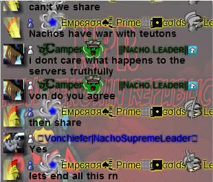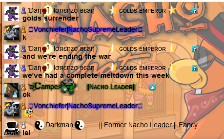 Welcome to the Nachos! We were one of the most powerful and legendary armies in all of Club Penguin. Known for our fun and enjoyable atmosphere, we're always having a good time! Due to Club Penguin shutting down, the army is mostly inactive. However, our older members tend to keep in touch using discord. You can join using the following link.