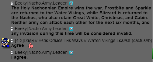 As of December 16h, 2014, the Water Vikings have surrendered the war to the Holy Nachonnian Empire. Only a few short days ago, WV gave us three options to maintain peace: merge, give them nearly all of our servers, or become a colony under them. They also offered us a fourth option. Though it didn’t really involve keeping peace.