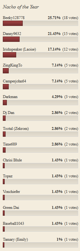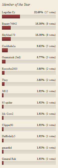 Congratulations Legofan Cy! You are the Number 1 Nacho Member of the Year! You have come quite a long way and I would leave to see everyone in this army excel and become the best they can be! You, all of you, are the backbone of this army. We are nothing at all with out you guys. You are the army, and whatever happens, you all stay loyal to us and you make the Nachos who they are!