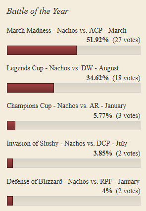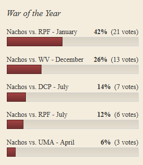 This has been a rather interesting year for the Nachos. We have had some long, drawn out wars, and quick, yet hyped skirmishes. With the recent ending of the ACP War and what seems to be “WW IVV” Coming to an end, we will care about us, the Nachos! The Winner of War of the Year is….