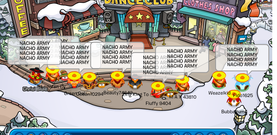 Welcome to the Nachos! We were one of the most powerful and legendary armies in all of Club Penguin. Known for our fun and enjoyable atmosphere, we're always having a good time! Due to Club Penguin shutting down, the army is mostly inactive. However, our older members tend to keep in touch using discord. You can join using the following link.