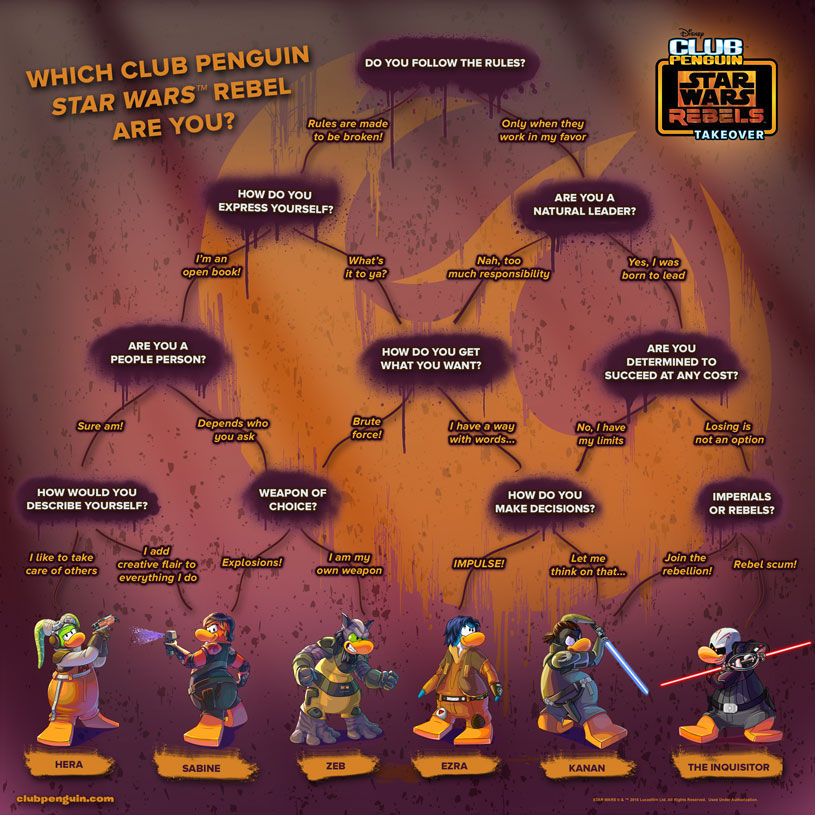 So as you know, the Club Penguin Star Wars Rebels Takeover Party is coming later this month to the island, and there’s a lot of characters from the show that you may or may not know. Megg from the Club Penguin team made this awesome flow chart to help you find your inner Star Wars Rebels character!