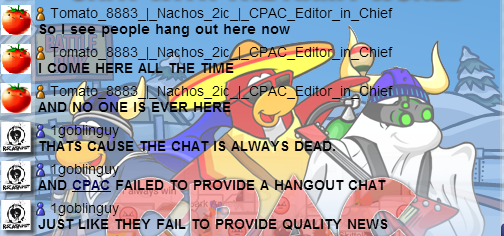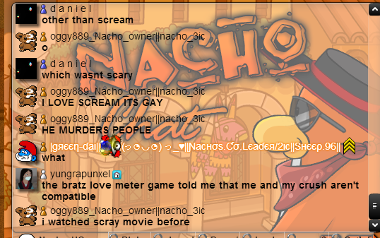 On the 9th of February 2011 I decided to pay a visit to chat. To my surprise there were actually people online, one of whom was Fido. It was because of Fido that I rejoined. He was (and is) incredibly nice and made me realise that I missed the Nachos very much. Sadly I had to start from the rank of Ranger. -.-. Because I was simply a member rank for much of this time there’s not much to really talk about. I think a conversation that occurred on chat and went something like this summarised my time in the Nachos back then;