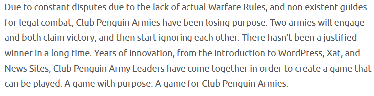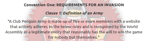ss+(2015-08-24+at+01.52.53)Apparently, there is an issue that there are no concrete rules to fighting in Club Penguin. This is news to me, I mean we’ve been through this long without a lengthy set of rules, why do we need this at all? However, moving on from that, there is also the need for someone to “win” wars here and have it decided by the group that is the most popular with the army community for some unspecified reason. “Sure! Lets do that!” said a small group of people with a lot of power in the CP Army sphere, by the names of Boomer, Omega, Oagalthorp, and Commando. These boys/men, very influential in their own rights (two being former leaders of ACP, and two being former leaders of RPF), decided to make this choice for all armies to start The World Assembly.