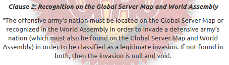 So here is the first clause of the first convention, which are requirements to invade someone. This clause details what an army is, to those who ratified the conventions and follow them. As we can see, there is already a glaring problem. In order to even be considered an army, you MUST follow these rules AND be recognized by an institution known as The World Assembly. We will get to TWA later, but this is already making small armies seem sub-human and inferior to larger armies. If you, say, don’t want to follow the rules listed below or don’t agree with them, then you might as well kiss your sorry ass goodbye, because no one in TWA will recognize you as an actual army, no matter how many members you have or events you carry out. However, lets say by some miracle that your army is in TWA. You’re safe, right? Think again, friend.