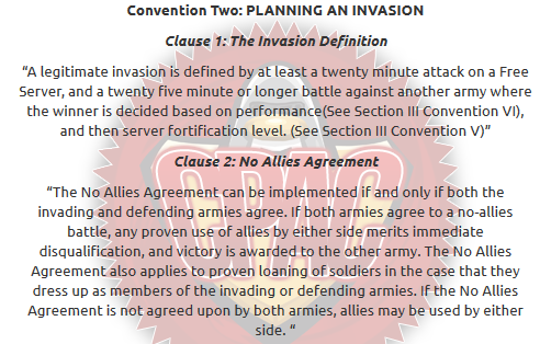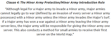 Oh. I guess not. In order for a small army to get its first server, it has to be pummeled by a major army in a war so the major army has to give them a server. You know what happens after you get your first server, and want to invade another large army (since they hold the vast majority of servers [according to TWA])? You have to repeat this process again. Since the larger army will inevitably win, and take the only server you have, it then forces that major army to give you one of their servers to keep you afloat and still recognized by The Mammoth Conventions. This is absolute insanity from someone who isn’t in a major army. It completely discourages new and growing armies to even try and fight back. In order to keep this as brief as possible, I will address the following clauses as one.