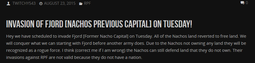 Finally, I am not against RPF declaring war on the Nachos, believe it or not. However, excuses like “They are an illegitimate force with no nation” can be utterly rebuked by looking at this website. The RPF must retract their statements regarding The Nachos that they claimed in their declaration of war. If you want to fight for “empty” land that “no one” owns, then you will be in for a rude awakening when you see The Nachos all over that land, ready to prove that they are indeed a nation and that they are defending their land, which has been theirs for many years now and cannot be “won” by making such incredibly stupid claims.