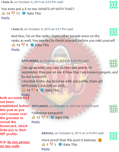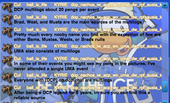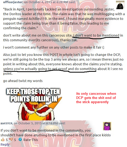 Now, as I am sure everybody and their mother is aware that a certain special report was posted a couple days back, explaining why on the most recent CPAC Top 10 that DCP, the “pillar of the community” received -10 points and put them in second place. This allowed Ice Warriors to obtain the #1 spot that DCP has coveted for so long and used as a club to hit armies smaller than them down and to claim that they are the strongest army in Club Penguin, even despite the fact that nearly every army that makes it to the Top Ten having an extremely good chance of getting that position. Neither here nor there, the report was posted, gong into extensive detail proving how DCP multi-logs on CP to achieve large numbers in events, with multiple pictures+a video posted showcasing each Dorito event over a period of 5 days that shows multiple non-member accounts with no stamps attending each of these events whom attend the DCP chat yet never say anything or talk back to their leaders or cause mischief or want to help lead in these events (like nearly 100% of recruits do in every army, with that number getting even closer to 100% the newer the recruit is). Even better is that these recruits were never added to the ranks of the army. Ranks and promotions are one of the features this community offers to keep people interested in that particular army, and the chance that one day that recruit will lead the army. Apparently, however, DCP recruits never wanted any of that, and don’t complain when the leaders “forgot” to add them to the ranks, and continue on each day wanting nothing more than to show up to events, being silent, and vanishing without a trace once the events are over.