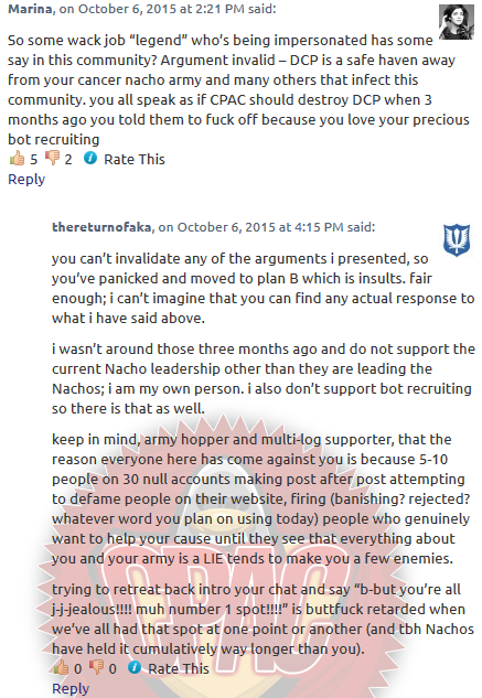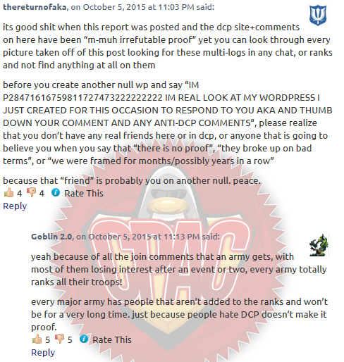 Edit: So I read the DCP response post and summed it up to “Nachos are stupid because they are stupid. Why are you guys so gullible? Lol, you’re stupid. Stupid stupid stupid.” Tbh I expected it, but either way, the main responses were “Why would they tell a 2ic to multi?” I don’t know, why wouldn’t musta tell one of his most trusted troops whom could lead the army in his absence to multi-log? If he wasn’t aound to multi for DCP, someone has to do it! I’m glad West convinced DCP that he was joking, or else he’d be out of a job right now, lol. For the “past/present” argument, yes I agree DCP did indeed have the #1 spot for awhile, but that was before everyone came to the agreement based on proof that DCP also bots 100% more than any other army. Something I noticed too is none of the nulls in DCP chat register their accounts or buy xats/days, nor do they buy memberships on CP, nor do they have wp accounts to comment with before the report was posted. Hmm……