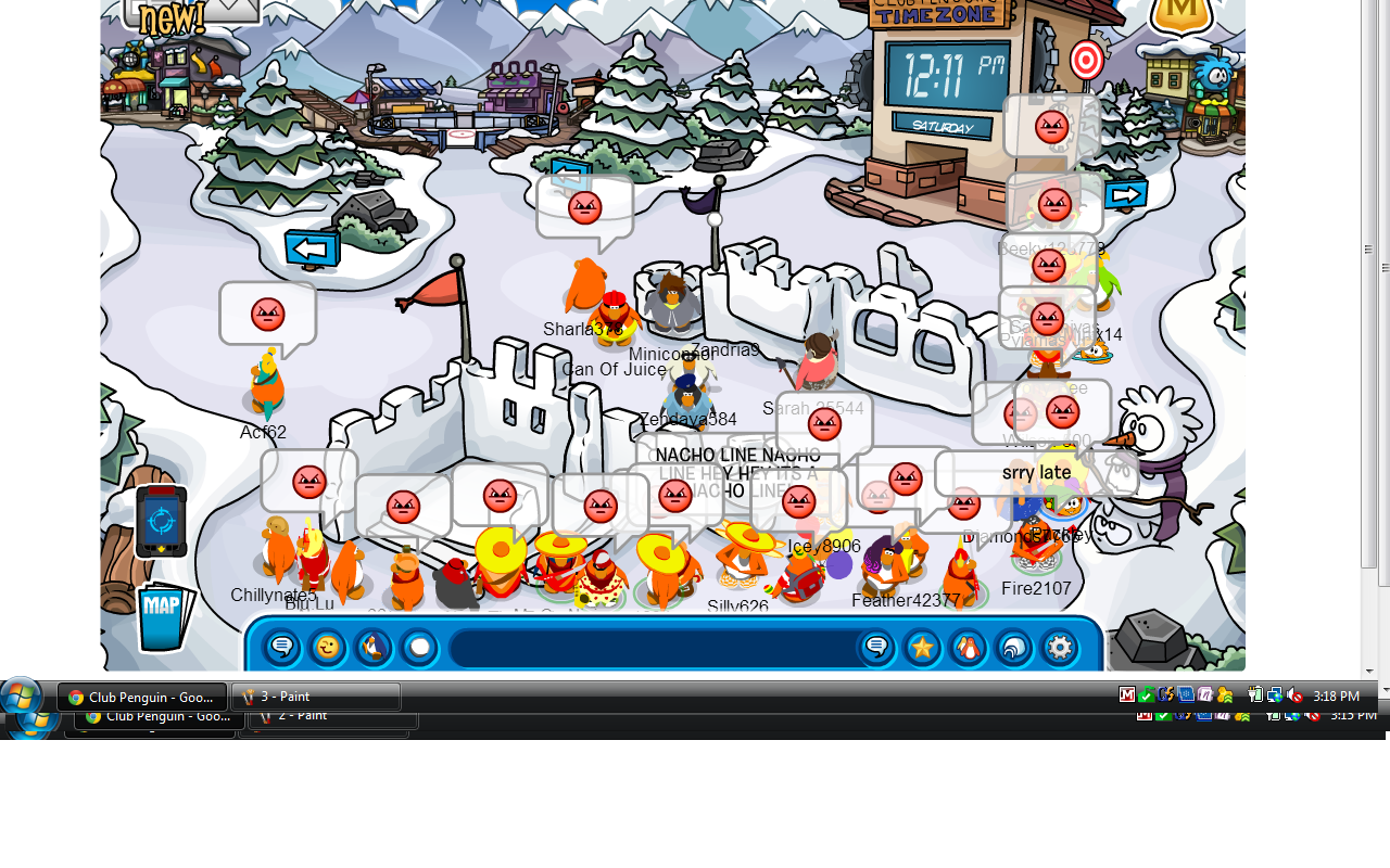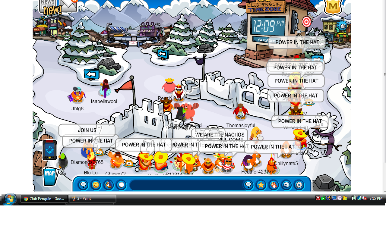 ***If you are having problems logging on Nacho Chat, try deleting your most recent history (just from today or tomorrow). If all else fails, just go to Fjord, Snow Forts***